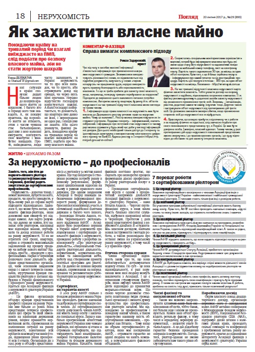 Деятельность Ассоциации специалистов по недвижимости (риэлторов) Украины часто вызывает интерес региональных и всеукраинских СМИ. На днях интересную статью о нашей организации разместили в последнем № 29 номере черновицкой региональной газеты "Погляд" (за 20 июля 2017 года).