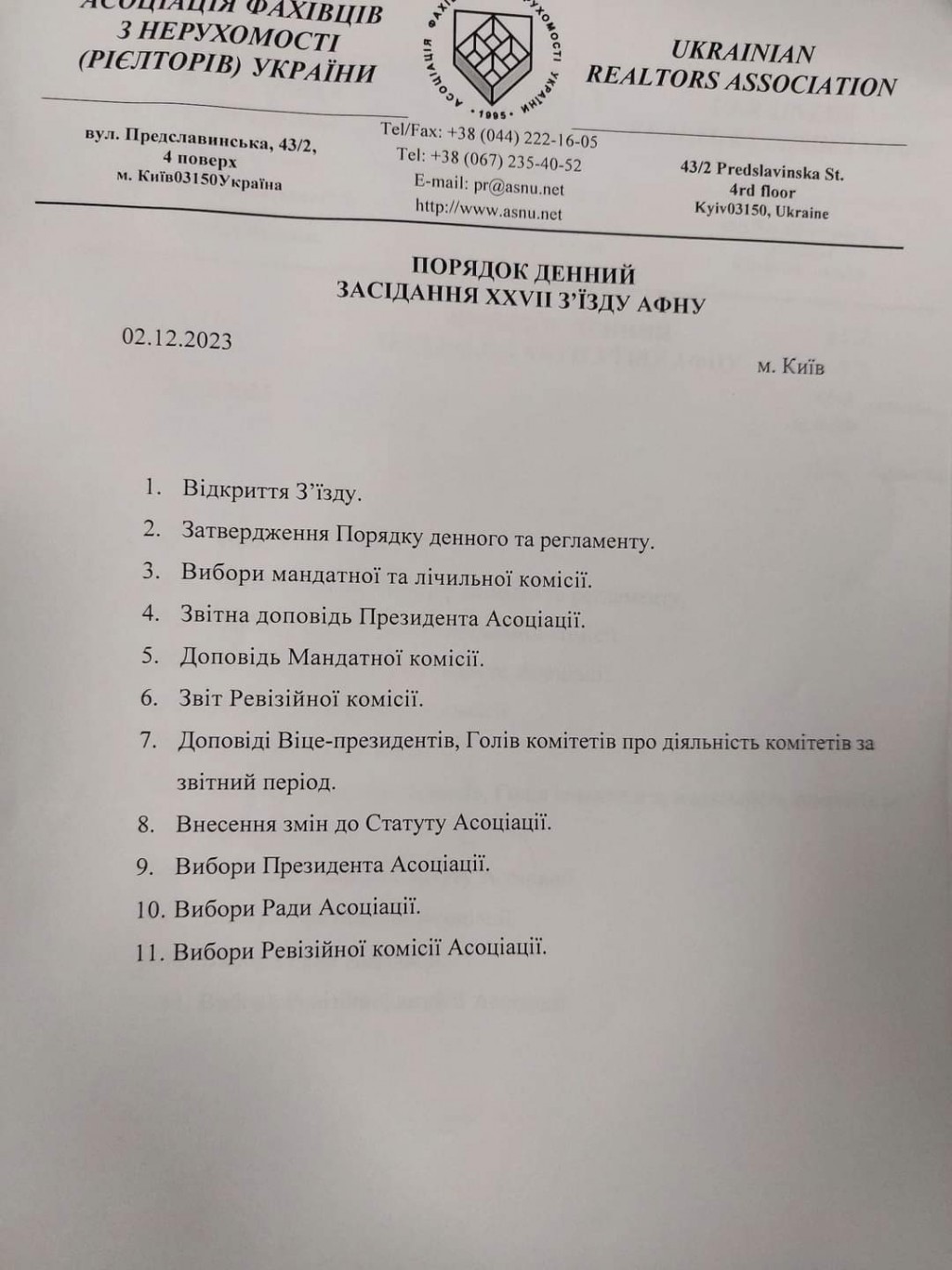 02 грудня 2023 р. в м. Києві відбувся ХХVII звітно-виборчий З’їзд Асоціації фахівців з нерухомості (рієлторів) України.