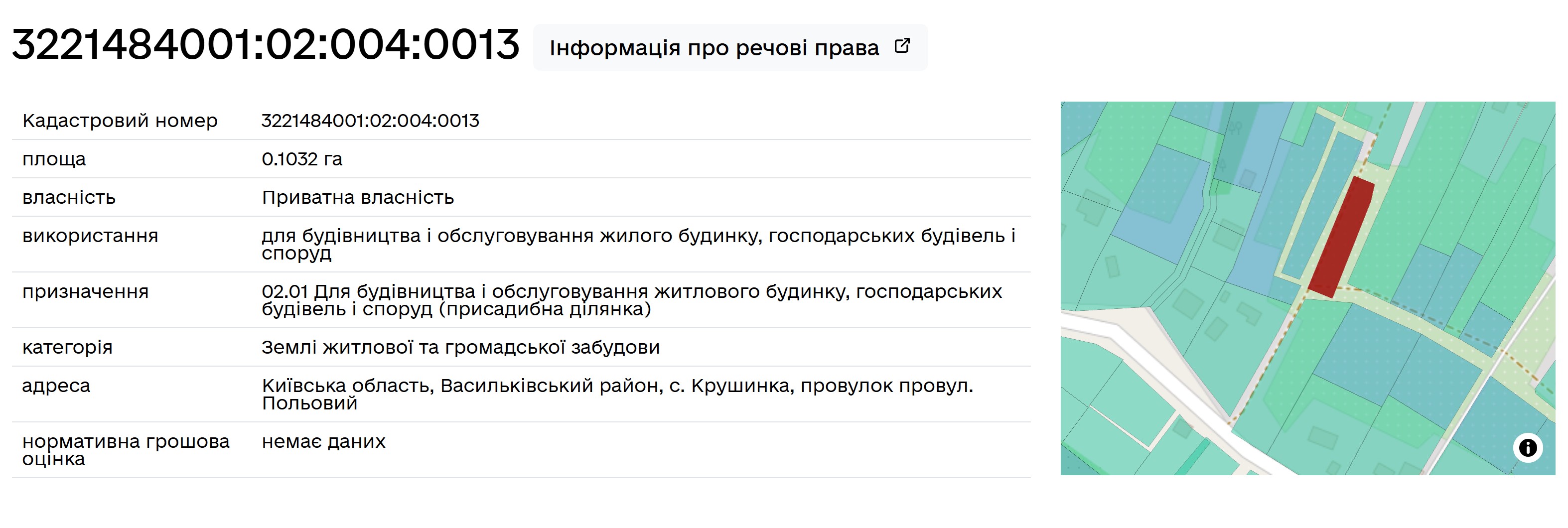 Основні характеристики: Площа: 10.32 соток (0.1032 га) Кадастровий номер 3221484001:02:004:0013 Призначення: для будівництва та обслуговування житлового будинку (присадибна ділянка) Категорія: землі житлової та громадської забудови Форма власності: приватна Адреса: Київська область, Васильківський район, с. Крушинка, провулок Польовий