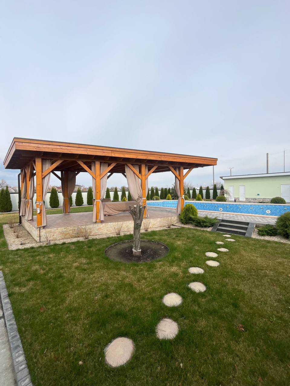 альтанка з дерева розміщена перед основним будинком;