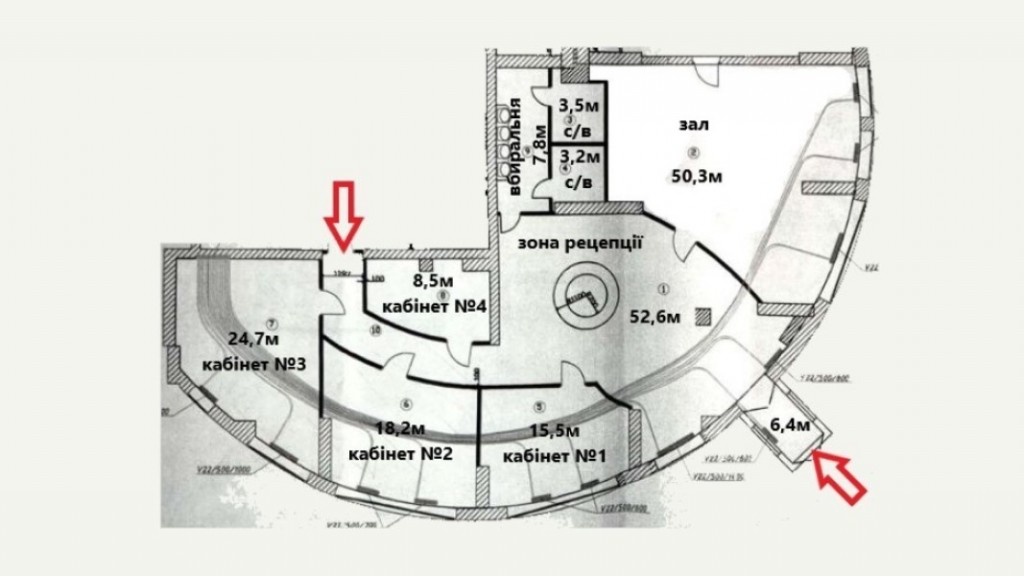 Планування: кабінет, 2 просторі зали, зона ресепшен, санвузол з двома туалетами.