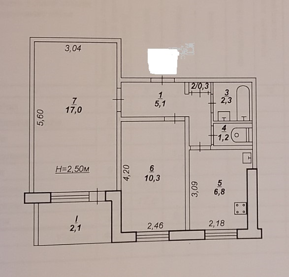 Загальна площа - 45.1кв.м, житлова - 27.3кв.м ( 17.0/ 10.3 ), Н - 2.50 м, кухня - 7.0кв.м, коридор - 5.1кв.м, ванна - 2.3кв.м, туалет - 1.2кв.м, комора - 0.3кв.м, лоджія - 2.1кв.м. Квартира одностороння- не кутова, кімнати роздільні, вікна мп, балконний блок-мп, балкон засклений- дерево. Лічильники: газ, вода, світло, тепло на будинок, будинок ОСББ. Квартира в житловому стані - потрібен ремонт. Перегородка на дві квартири.