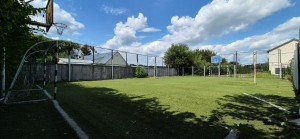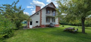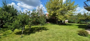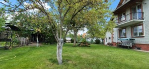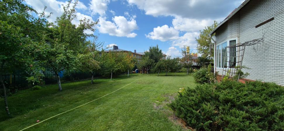 На земельній ділянці висаджені фруктові дерева та декоративні рослини, газон, у дворі хоз. приміщення, літній стіл, гойдалка. металевий паркан.