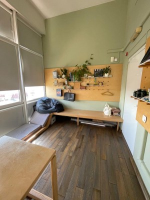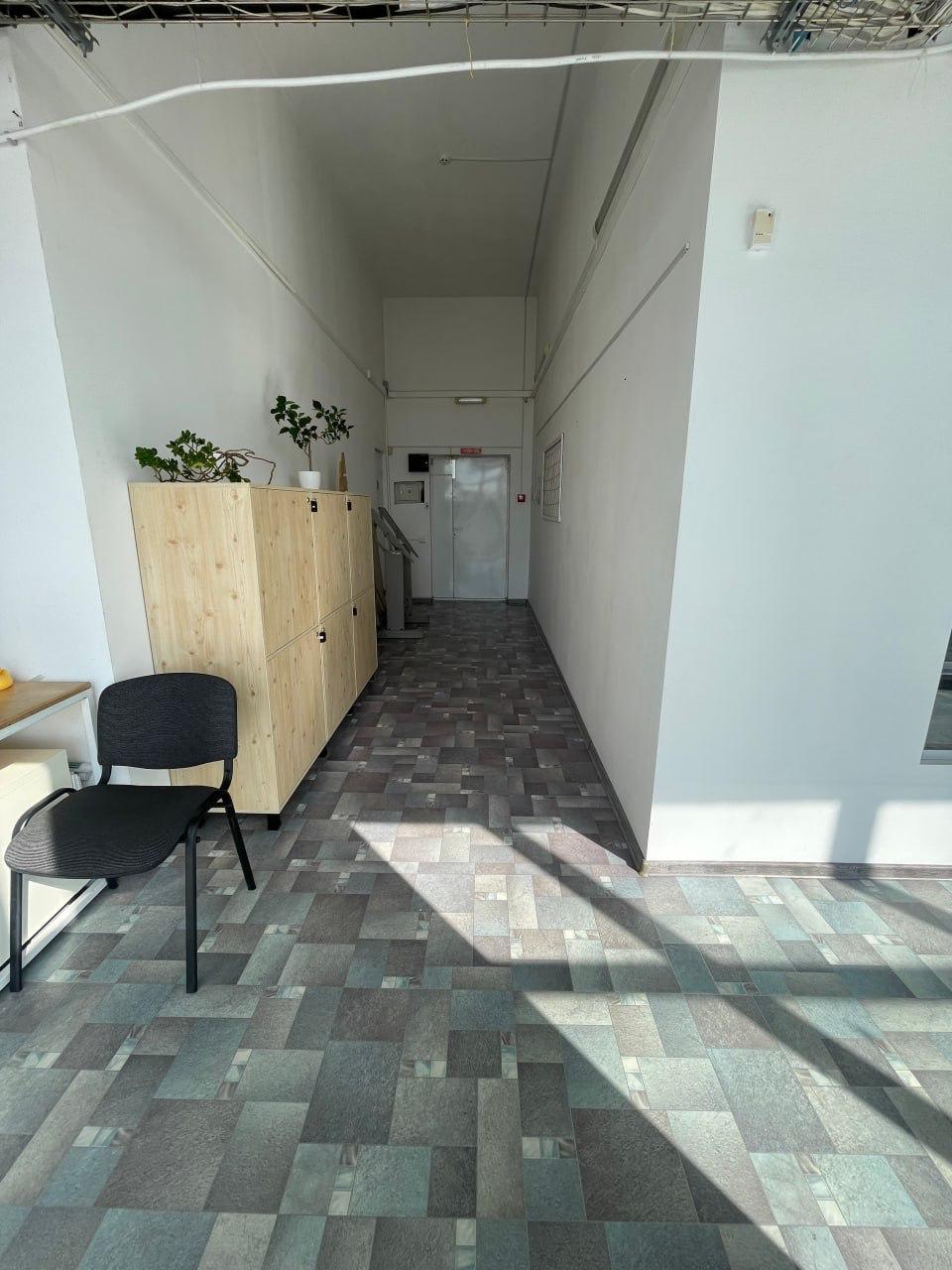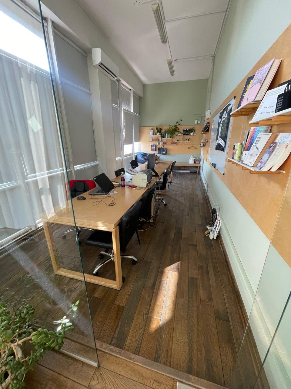 Площа 37 м². Складається з основної кімнати та окремого кабінету за склом. На поверсі лише два офіси - тиха робоча атмосфера. Додатково спільний коридор, санвузол, зона кухні, балкон. Є мікрохвильова піч і кавомашина, спільні для поверху.