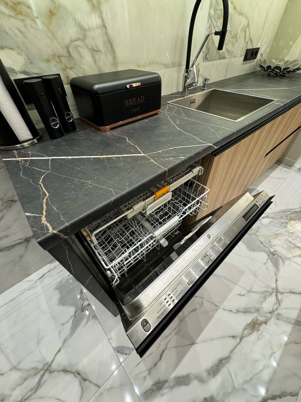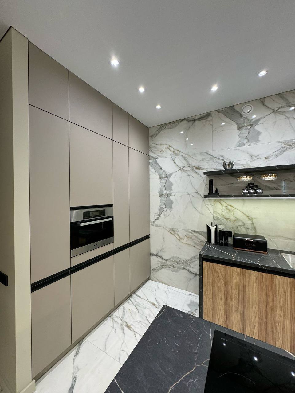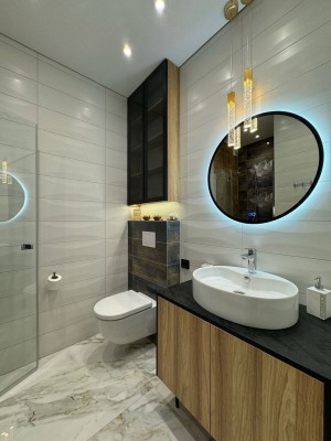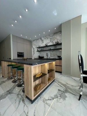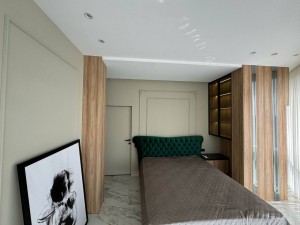 Ремонт виконаний з дорогих та якісних матеріалів у світлих, спокійних тонах.