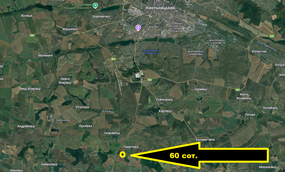 Продам земельну ділянку 60 соток с. Перегінка (напрямок Кам’янець - Подільського) 8 км. від обласного центру. Дорога до ділянки майже вся відсипана (60 метрів польова). 8.3 кілометра від знака Хмельницький до поворота в с. Перегінка по рівній асфальтованій дорозі (до 7хв на авто), в місто ходить автобус. Ділянка межує з лісом. Рівна ділянка і правильної майже квадратної форми 83*73м. Світло поруч.