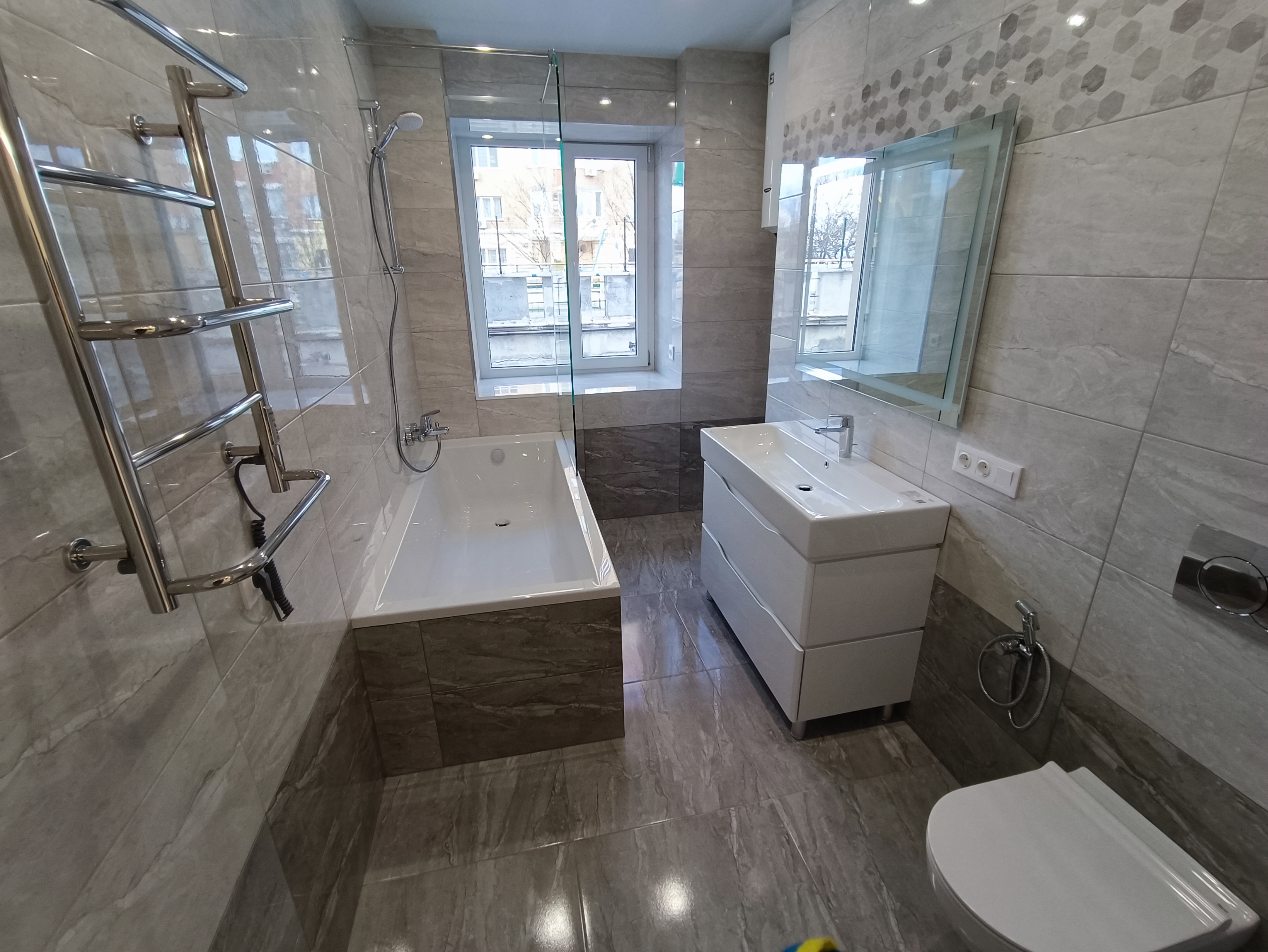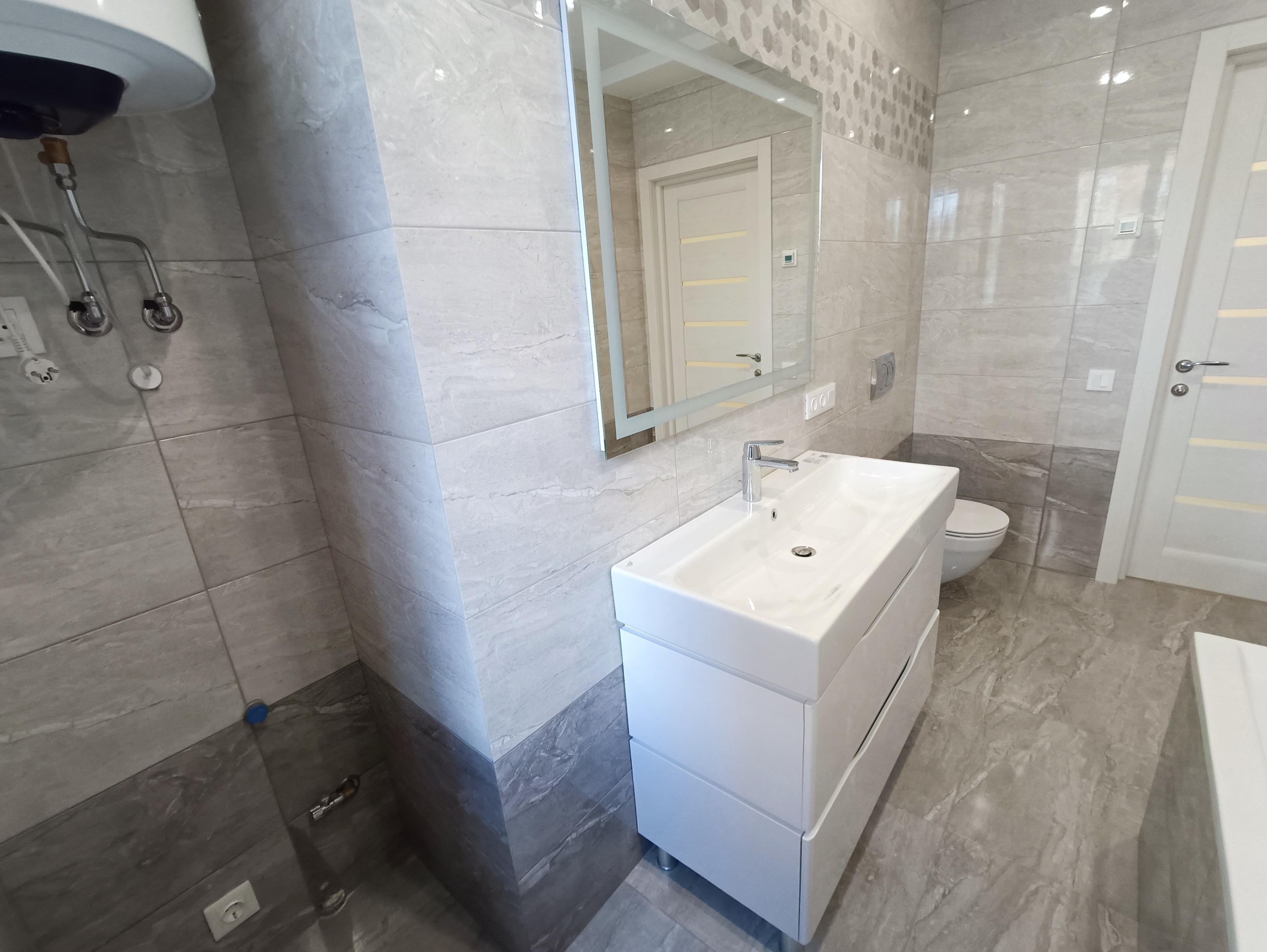 санвузол мають підлогу з підігрівом. Запас електро-потужності 15 кВт, 380 V, 3 фази, 32 А (ампера) автомати. На все встановлені