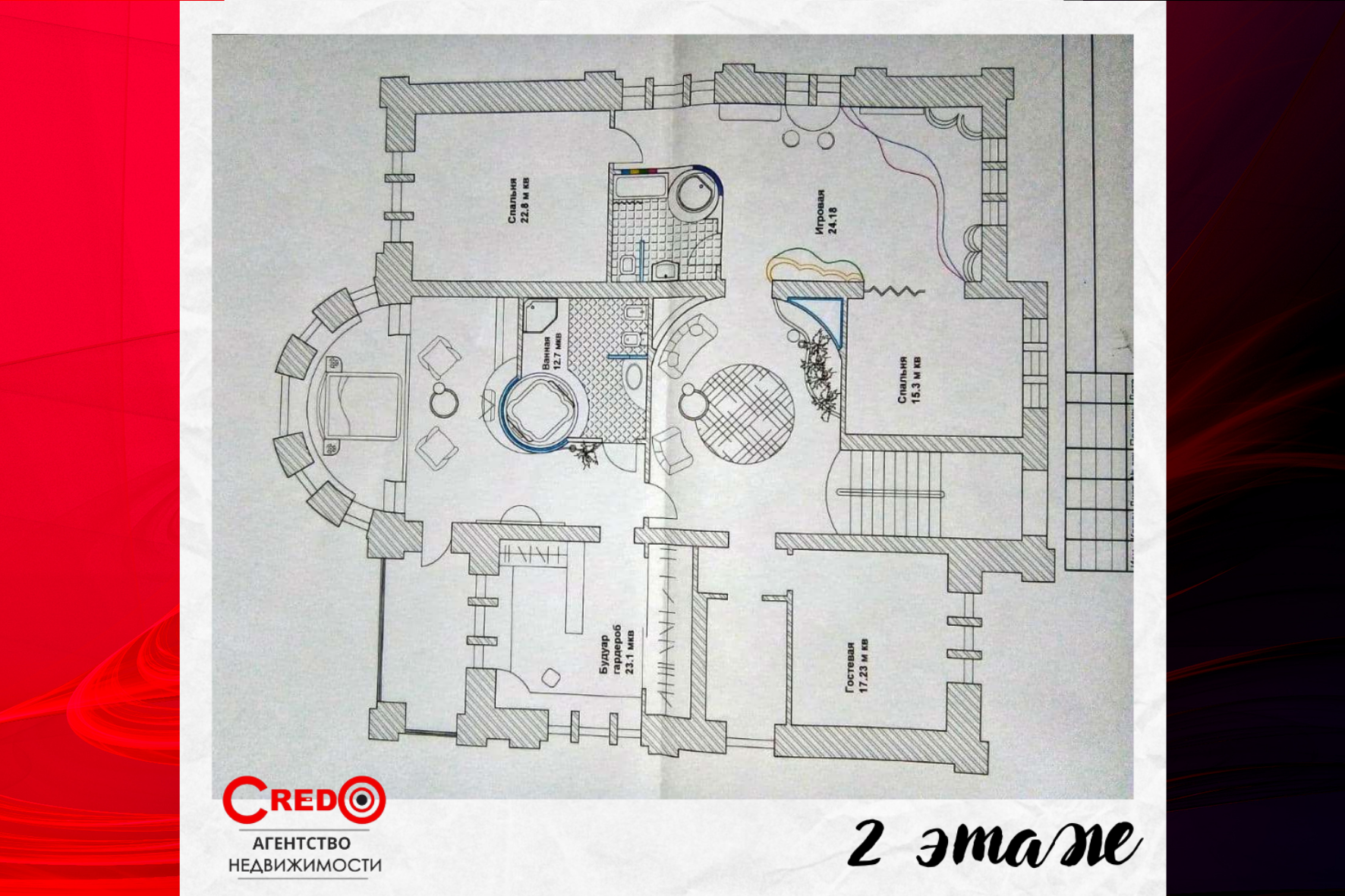 На 2-м этаже 5 комнат, большой зал с лоджией, две ванные комнаты, с частичной внутренней отделкой.