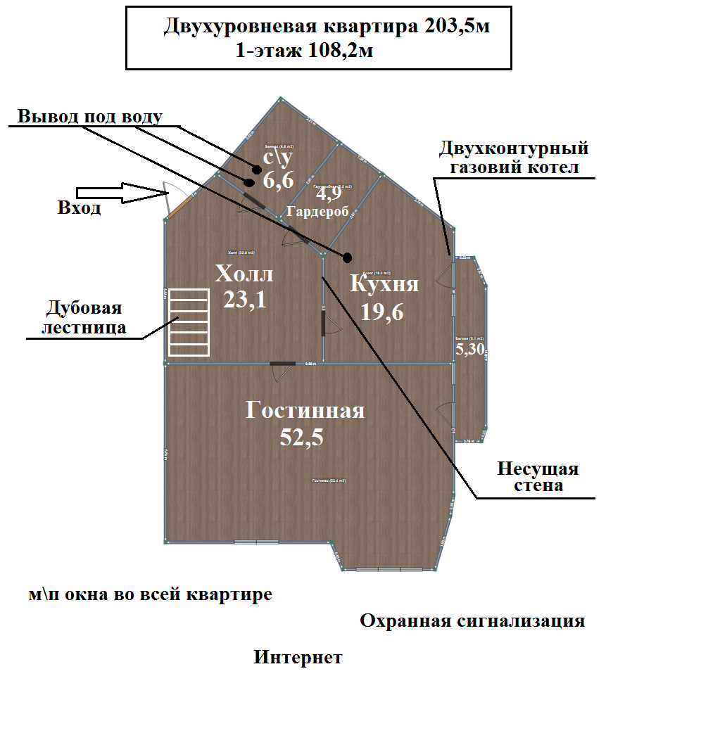Сделан косметический ремонт год назад, столярка, лестница дубовые, м/п окна, пол плитка и паркетная доска, 2 балкона( обшиты деревянной вагонкой и утеплены), высокие потолки-3м. Установлен двухконтурный газовый котел, счетчики учета холл. воды, газа, электричества, охранная сигнализация.