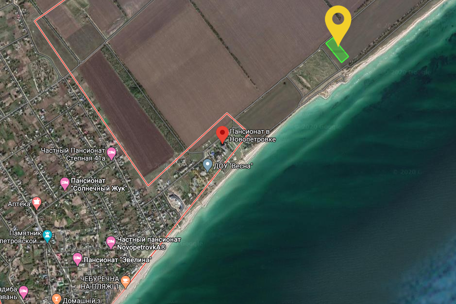 Участок расположен в 10 км от Бердянска в селе Новопетровка у открытого Азовского моря и песчаного пляжа. Участок 109,9 соток, земля приватизирована.