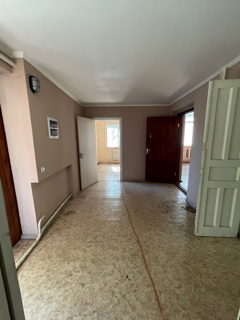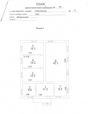 Загальна площа – 115м2, h – 3m. Хол – 11м2, велика кімната – 42м2, 4 кімнати (10м2, 14м2, 14м2, 15м2), санвузол (8м2).