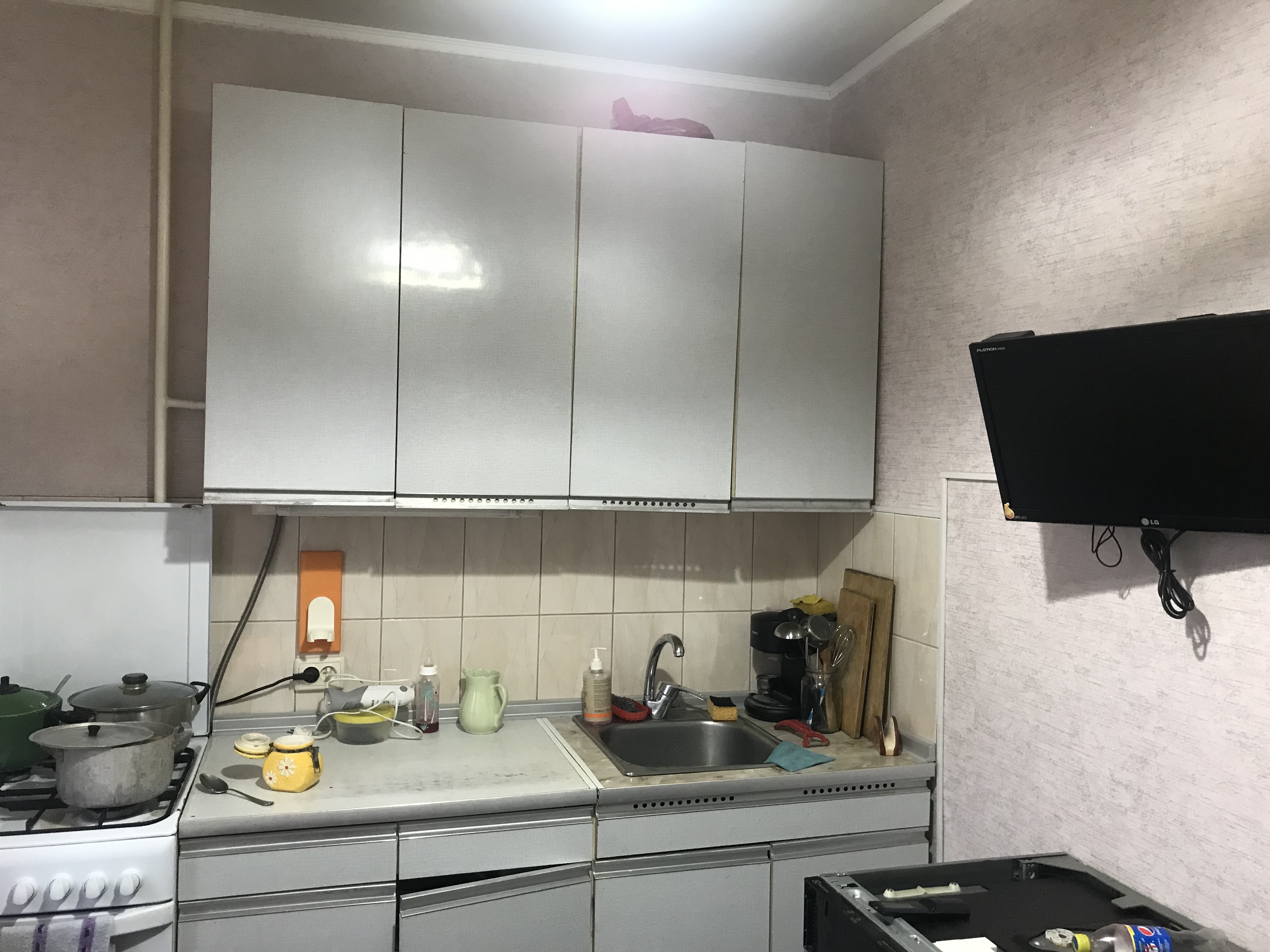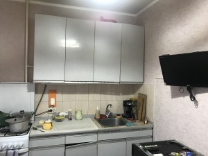Шпаклеванные стены и потолок в двух комнатах. В кухне шпаклеванные стены и натяжной потолок.