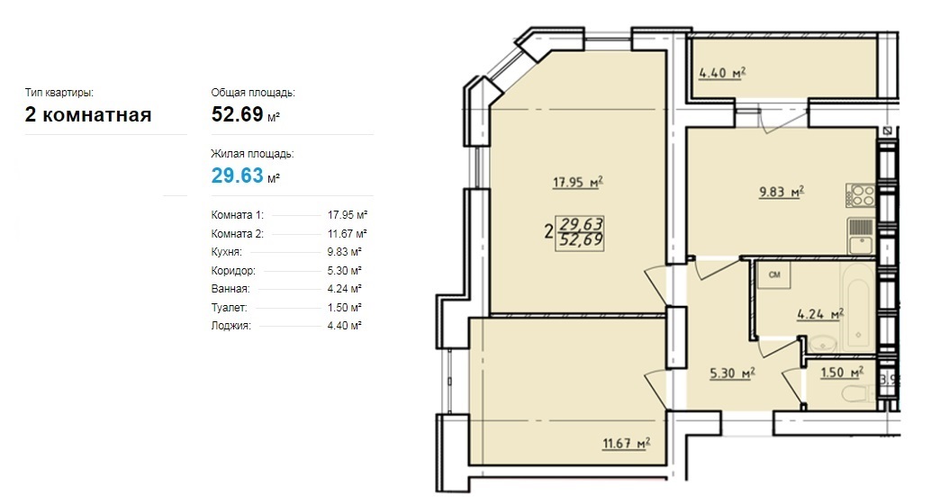 Загальна площа: 52 кв.м