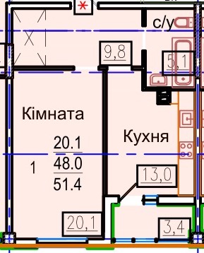 Загальна площа: 51.4 кв.м