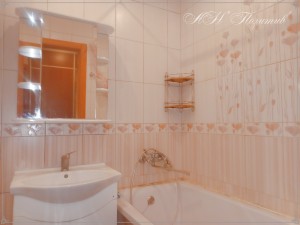 Санвузел та вітальня з ремонтом, обладнані якісними вбудованими меблями.