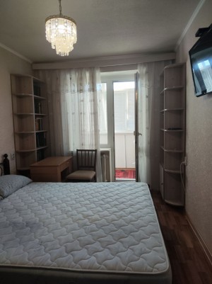 Квартира виходить вікнами в двір,має 2 роздільні кімнати,роздільний санвузол,велику кухню,балкон,є все необхідне для життя, пральна машина автомат,великий 2 камерний холодильник. Квартира повністю мебльована,в спальні 2 спальне ліжко з ортопедичним матрацом,в вітальні м'який куток,мебльована кухня,стінка,вбудовані шафи