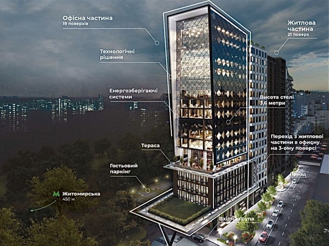 Внутри бизнес-центра офисы площадью от 42 до 4000 м², ресторан, коворкинг, учебный центр и конференц-залы.