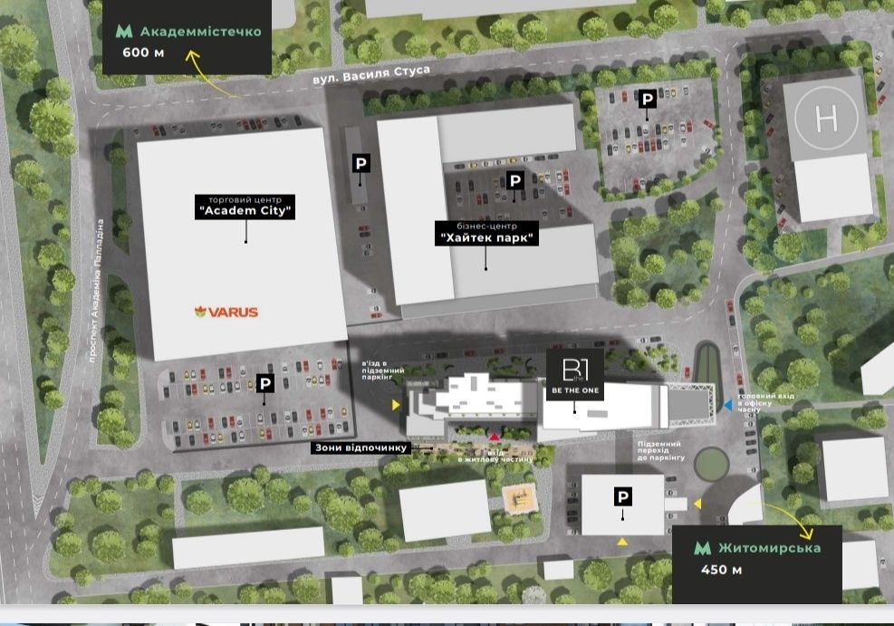 Для продуктовых покупок в минуте возле дома Varus, в 8 минутах Novus и в 10 минутах «АТБ». Также в пешей доступности торговый центр «Академ Сити» и «ВМБ», работают несколько ресторанов и кафе.