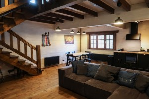 • 1-й поверх: кухня-вітальня (38,8 м2), спальня, санвузол, комора.